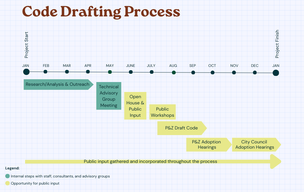 Installments 1, 2, and 3 are tentatively scheduled for 2026, 2027, and 2028 respectively. Topics for each installment were set by the Planning and Zoning Commission and City Council, who staff will continue to take direction from as the project continues. As such, topics and timelines may be subject to change.