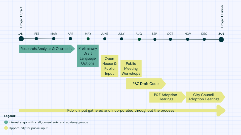 Phase 3 code updates will happen in three installments. Each installment is expected to take about one year to complete. City Council and the Planning and Zoning Commission have set priorities for the code changes in each installment; four main topics are being addressed in installment 1.
